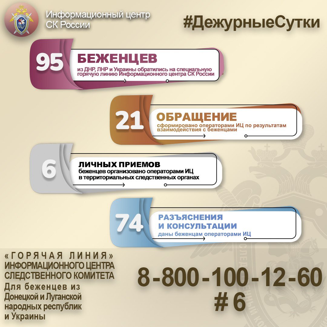 9️⃣5️⃣ беженцев из ДНР, ЛНР и Украины обратились на специальную горячую линию Информационного центра СК России 2️⃣1️⃣ обращение сформировано операторами по результатам взаимодействия с беженцами 6️⃣ личных приемов беженцев организовано Информационным центром в территориальных следственных органах 7️⃣4️⃣ разъяснения и консультации даны беженцам операторами Информационного центра ❗Напоминаем, что обратиться в Информационный центр СК России вы можете: 🔸«ВКонтакте» - Приемная Председателя СК России vk.com/priemnaya_bastrikina и группа Информационного центра vk.com/infocentrskrf 🔸«Телеграм» — канал t.me/infocentrskrf 🔸«Одноклассники» — группа ok.ru/group/61254572769397 🔸8-800-100-12-60 - единая многоканальная телефонная линия (круглосуточно) #ГорячаяЛиния #ДежурныеСутки #Донбасс