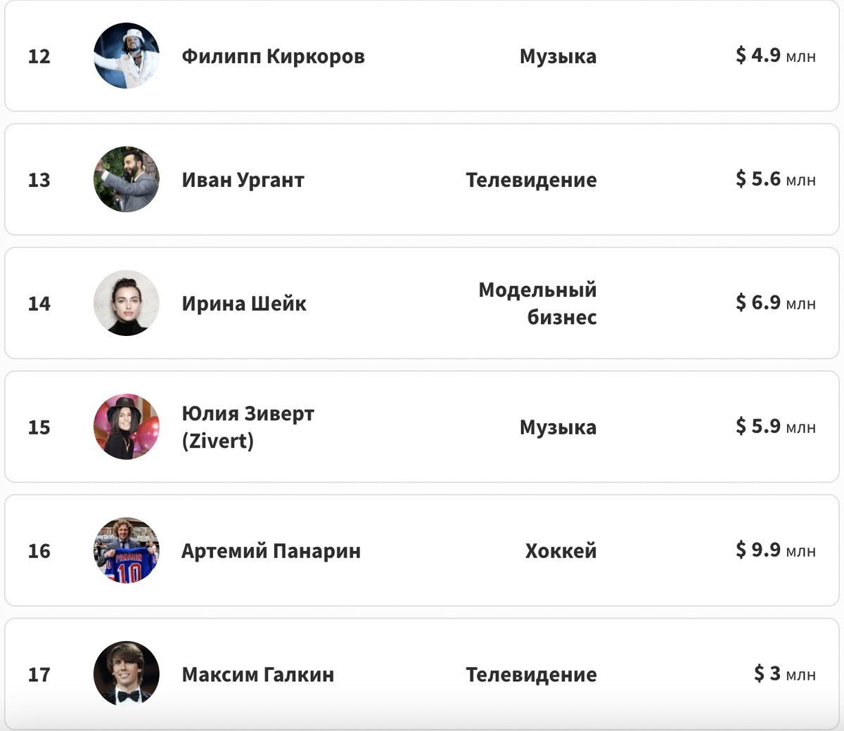 В прошлом году Forbes поместил Галкина на 17 позицию по размерам дохода – три миллиона долларов США, это всего четверть миллиарда рублей: Но верны ли цифры? Ведь речь только о том, что официально декларируется и исключительно в одной профессиональной сфере. А реальные заработки этого артиста складывались (именно в прошедшем времени) из шести составляющих. Чёсы Билеты на концерт стояли от трёх до десяти тысяч рублей, география маршрутов хотя и была лимитирована санитарными ограничениями, позволила собрать эти самые три миллиона долларов только на гастролях. ТВ-шоу Информация о гонорарах за проекты неизвестна, но в ТВ-кулуарах слышал, что только а участие в проекте «Один в один» гонорар – полмиллиона баксов ежемесячно. В целом на ТВ за год миллионов десять, вероятно. Реклама Суммы контрактов Галкина не разглашались, но если столько же, сколько такого же масштаба коллега на том же канале, то опять те же три миллиона американских рублей © за 2021 гож. Ведение Стоимость участия в концертах
