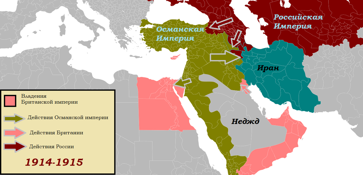 Война между Османской империей и Антантой началась осенью 1914 года, после того как турки обстреляли порты России на Черном море. Боевые действия развернулись на Кавказе, в Месопотамии и Иране, а также в Леванте, Аравии и Египте. Я не буду разбирать ход событий на Кавказе, только события в арабоязычном регионе.