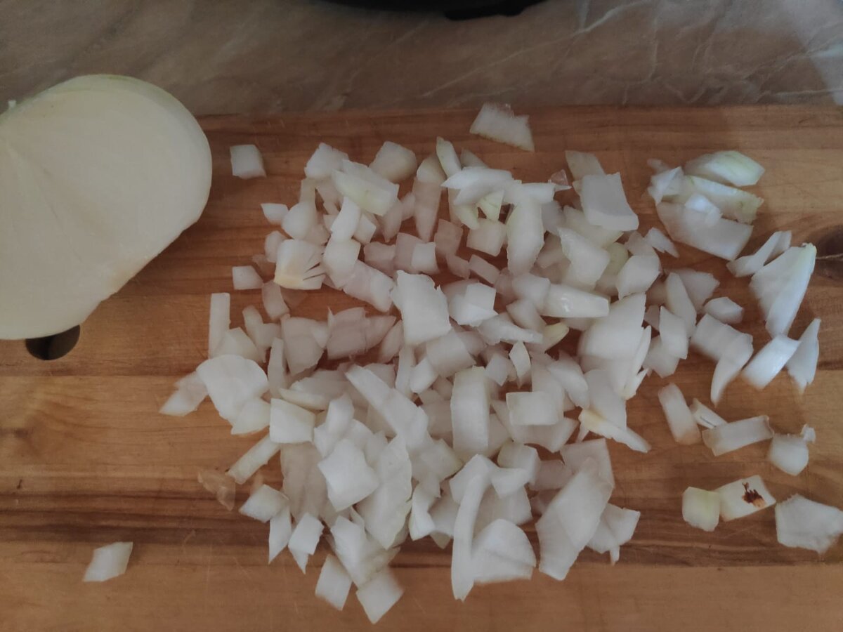 Третье: Пока ингредиенты обжариваются, почистим картофель и нарежем кубиками.