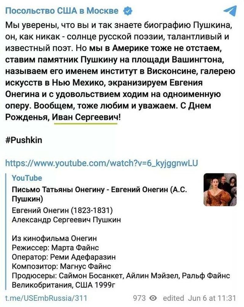 1. Американские дипломаты из посольства США в Москве решили проявить дипломатическую вежливость, написав в своём Телеграм-аккаунте не очередной рекламный пост ЛГБТ и не очередную антироссийскую агитку, а вроде бы вполне позитивный пост о дне рождения нашего великого поэта Александра Пушкина. Казалось бы, вот наконец разумный и достойный всяческого одобрения жест... Однако и здесь американцы сумели подтвердить наше мнение о США (ссылка):
