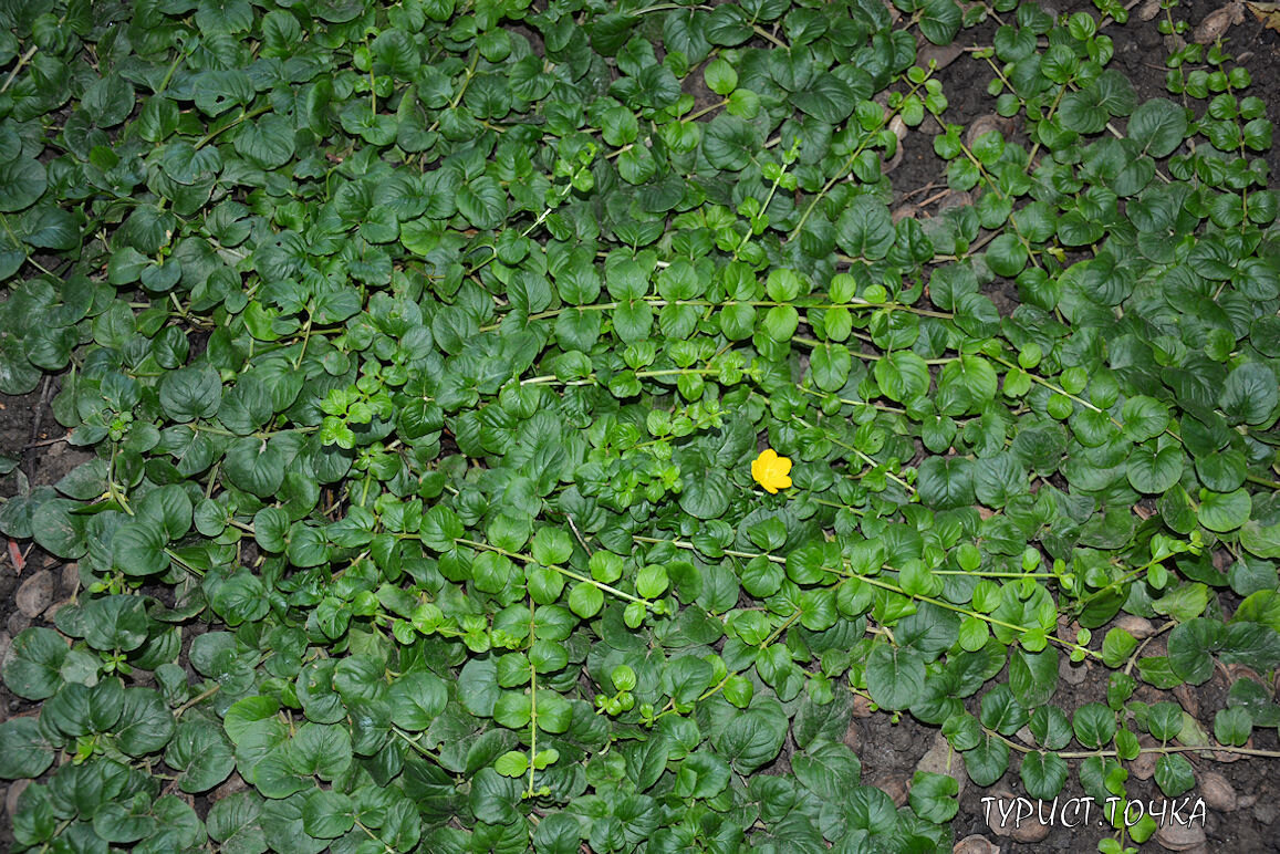 Покрывает почву низким плотным зелёным ковром. Или жёлтым, в зависимости от сорта. Название многолетник получил за то, что его небольшие листья напоминают формой монетки. А ещё из него делают чай, поэтому его второе имя – луговой чай. Вербейник монетчатый цветёт маленькими жёлтыми цветками обычно с июня до августа. Мои вербейники растут в тени и как раз сейчас цветут. Но ценят его отнюдь не за цветы, а за ползучесть. Стебли вербейника могут расползаться до 80 сантиметров от главного корня, и по пути ещё и укореняться. Высота растения всего 5-10 см. И что мне нравится, он плотно прижимается к земле, а не топорщится, как барвинок. Латинское название вербейника монетчатого – Lysimachia nummularia. Помимо дикого вида, есть 3 декоративных: Green Carpet – самый распространённый, с ярко-зелёными крупными листьями. Aurea – с более мелкими золотисто-салатовыми листьями. Зеленеет в тени. Goldilocks – жёлтые листья, которые на солнце становятся ещё ярче. У меня растут два первые сорта, зелёный и