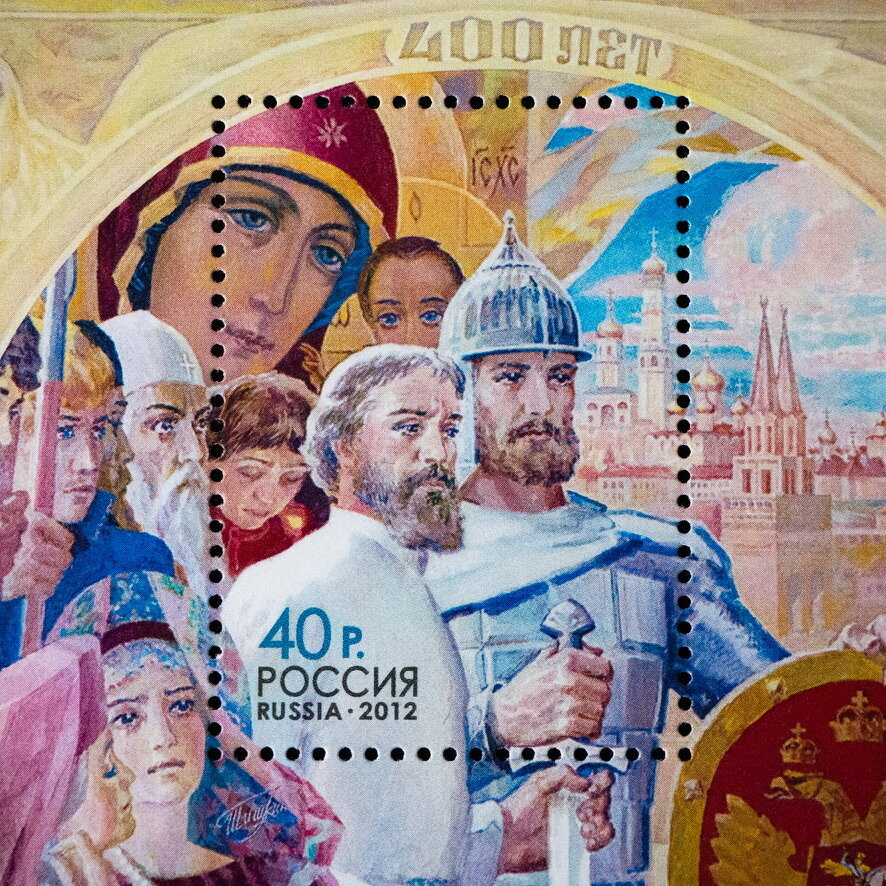 Смутное время — это период с 1598 по 1613 года, когда с Российским государством случилось все что только может быть: смена династии монархов, междоусобная борьба, многочисленные войны, интервенция, предательства и многое другое. В 1612 года народное ополчение, возглавляемое нижегородским купцом Кузьмой Мининым и князем Пожарским разбило сначала польско-литовские войска в битве на Девьичьем поле, а затем и гарнизон, контролировавшей Московский Кремль. На почтовом блоке изображены Козьма Минин, Дмитрий Пожарский, Патриарх Гермоген, образ герба 1612–1620-х гг. и Казанской иконы Божией Матери на фоне старой панорамы Московского Кремля. Российская Федерация «400 лет восстановлению единства Российского государства» 2012 Цена: 79₽ Лот №z1639-1 Сохранность: чистая MNH Тираж: 90.000 Каталожный номер: 1647 Дата выпуска: 2 ноября 2012 КСТАТИ, все последние материалы, отсортированные по странам и сериям, можно найти на моем сайте. Оплата: Сбербанк, Альфа-банк, Газпромбанк, Авангард и Тинькоф.
