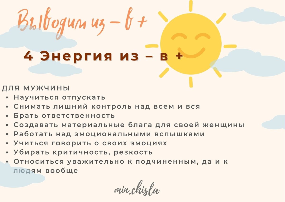 Тезисно расписала на картинке ниже. В разрезе мужчин и женщин, на что особенно нужно обратить пристальное внимание в работе над собой, чтобы вывести энергию числа рождения в плюс.