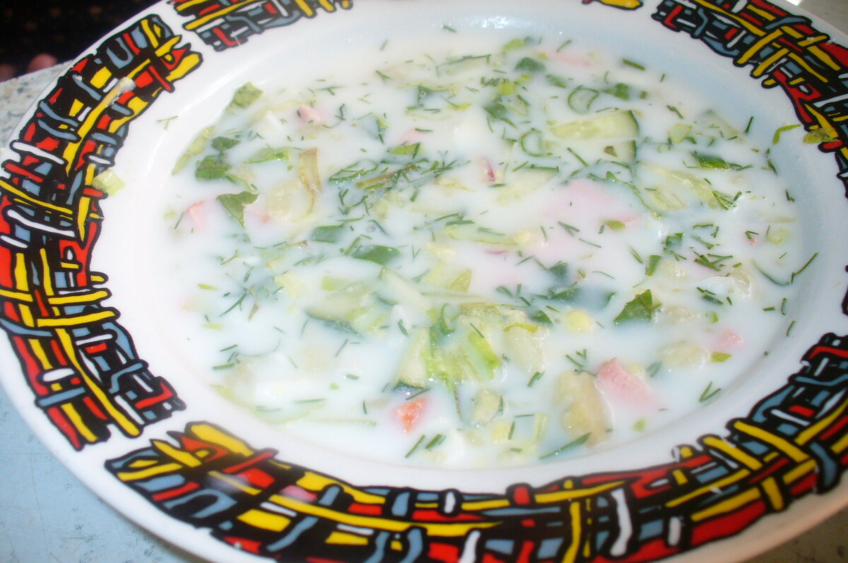 В качестве мясной составляющей для этого варианта окрошки идеальны копчености или рыба. Для заправки разотрите желтки с парой чайных ложек горчицы. Все остальное, как обычно.