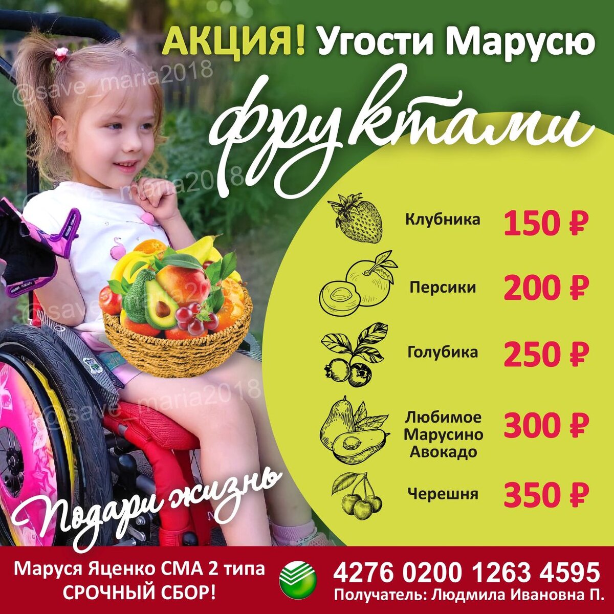 @save_maria2018 в Instagram. Началась летняя пора. Сезон фруктов. Наконец-то мы можем питаться сезонными витаминами. Хотите угостить Марусю её любимыми ягодами-фруктами?) выбирайте: - клубника 🍓 - 150₽, - персики 🍑 - 200₽ - голубика 🫐 - 250₽ - и, самое любимое - авокадо 🥑 - 300₽. Сейчас уже пошла черешня 🍒 Можно также угостить Марусю - 350₽. Спасибо за угощения!! 💛 Помогать легко👇 ♨️ лайк ♨️ добавить себе в сториз ♨️ отправить репост своим друзьям и знакомым ⠀ 👧🏼Маша Яценко 4 года 💰Сумма сбора = 121 000 000 руб 🆘Собрано - 69 533 810 руб ⠀ 🔴 Реквизиты родителей👇 ⠀ 💳Сбербанк: 4276 0200 1263 4595 💳Альфа-Банк: 5559 4937 1275 6791 Мобильный банк: 8 902 999 99 84 Получатель: Людмила Ивановна П.(мама) (Liudmila Panasenko) ⠀ 💳Тинькофф: 5536 9138 2218 6397 Получатель: Евгений Петрович Я. (папа) 📍Qiwi: 89029999984 📍Яндекс деньги: 4100115433270241 #фруктоваякорзина #фруктоваякорзинамосква #фруктоваякорзинаспб #фруктоваякорзинаростов #фруктоваякорзинаказань ##фруктовыйсалат