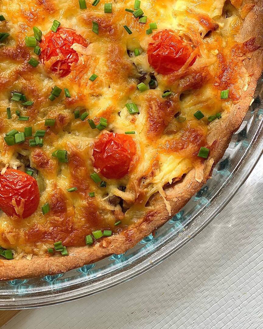 Надихаю харчуватись правильно і корисно. Ингредиенты: цільнозернове пшеничне борошно, яйце, 6% творог, Сіль,перець, Начинка, куряче філе, грибів(печериці), вершки 10%, Ріпчаста цибуля, кабачок, яйце, твердого сиру, чері томатів, Сіль,перець Способ приготовления: Змішати все для тіста і замісити.Розкатати і викласти в форму діаметром 26см. Проколоти дно виделкою І поставити в духовку на 10 хв при 180 градусах. Для начинки:на суху сковорідку філе кубиками,трішки підсмажити у власному соку(без олії/масла),додати нарізані кубиками печериці,кабачок і цибулю.все посолити і поперчити.Як тільки випариться рідина,влити вершки і протушити 5хв. Всю начинку викласти на тісто, Порізані чері викласти на начинку. Змішати яйце, тертий сир і влити на начинку. В духовку на 30хв при 180градусів.