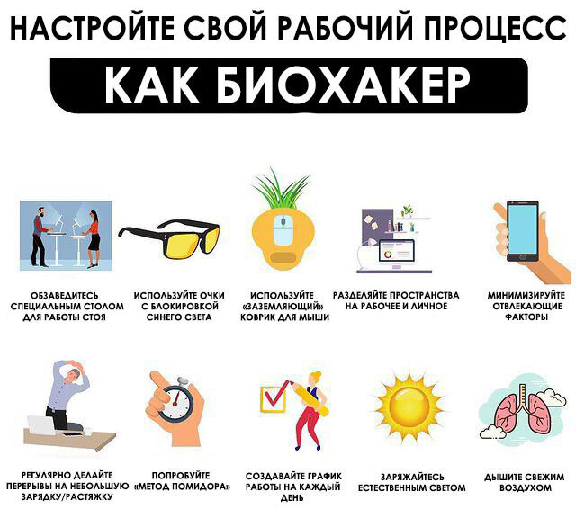 Мы тратим около трети своей жизни на работу. Поэтому, если мы правильно настроим свой рабочий процесс, то сможем легко и быстро улучшить свое здоровье. Неважно, работаете вы дома или в офисе, практически все эти биохаки бесплатны и крайне просты в реализации. ✅ 1. Работайте стоя или используйте стул седло с разделенными частями Во время нашего эволюционного процесса, мы находились в положении согнутой в талии пищеварительной системы или затрудненного кровяного тока крайне редко. Подкладывайте что-нибудь твердое под монитор или приобретите специальный стол. ✅ 2. Используйте очки, блокирующие синий свет Мы эволюционировали, подвергаясь воздействию исключительно естественного света полного спектра, а не поддельного, светодиодного, “мусорного” света. Свет влияет на наше здоровье и гормоны, поэтому обязательно используйте очки, блокирующие синий свет. ✅ 3. Заземляющий коврик для мыши В процессе эволюции, мы развивались, постоянно находясь снаружи и у нас не было резиновой обуви, изолирующей