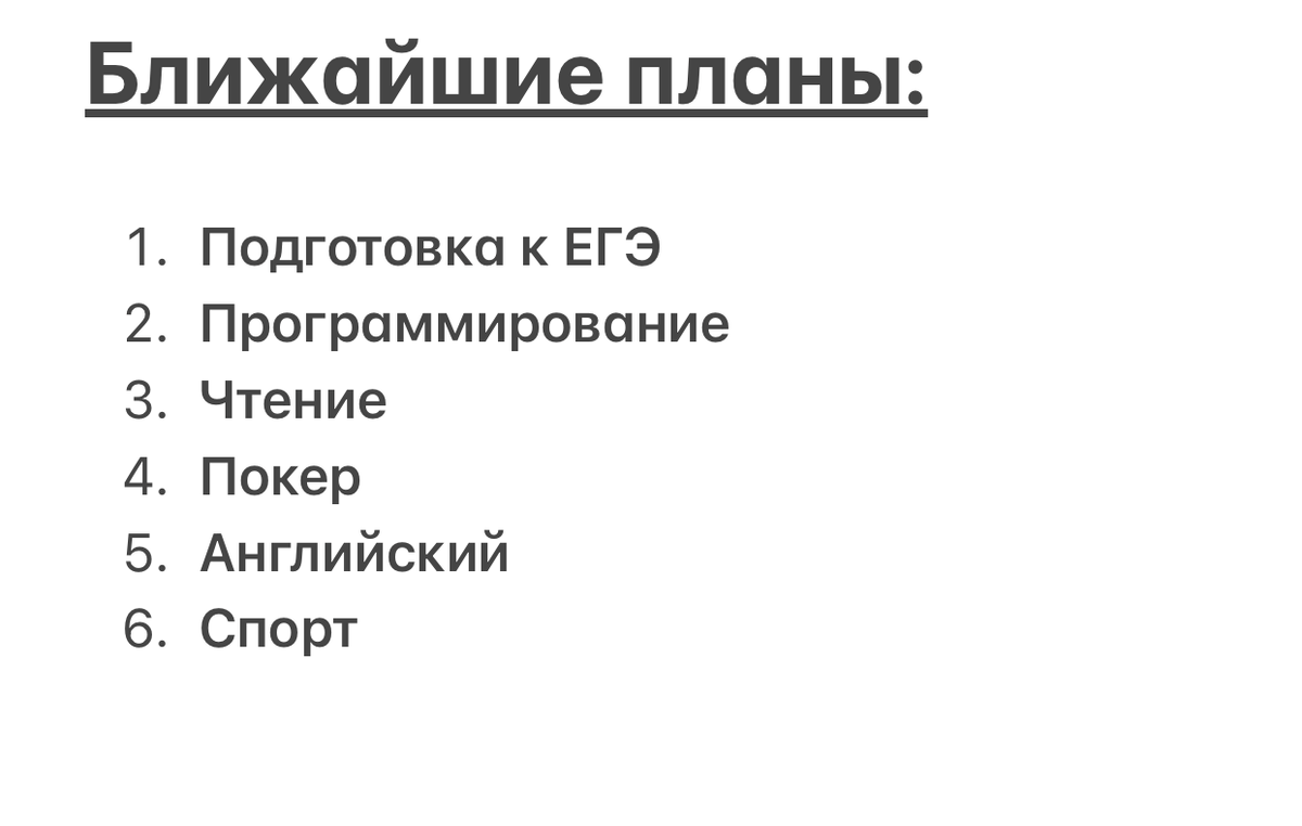Только к 29 годам я понял, что мои планы почти никогда не сбываются. Из-за своих заоблачных мечт и переоценки сил, я, как оказалось, ставил себе всегда невыполнимый план. (Скорее это даже был не план, а просто типа «так, надеюсь через пол года я выберусь из бедности, надо только найти своё призвание, а там дальше легко») Невыполним он был из-за отсутствия каких либо у меня навыков (я ничего не умею и не образован), либо мои цели предполагали большое количество усилий. А я всегда стремился самореализоваться в чем-либо без особых усилий. Развиваться я начал только недавно, приобретать какие-то навыки. Поэтому поставлю себе достаточно выполнимый план на ближайшие 2 месяца, так как по моим расчётам, деньги у меня закончатся примерно через это время. И так: 1. Продолжаю готовится к ЕГЭ. Надеюсь, в конце мая - июня, знать математику и русский на уровне 7го класса (пока что мой уровень где-то 6ой класс) 2. Начать изучать программирование (начну наверно с языка «Паскаль», чтобы просто было пол