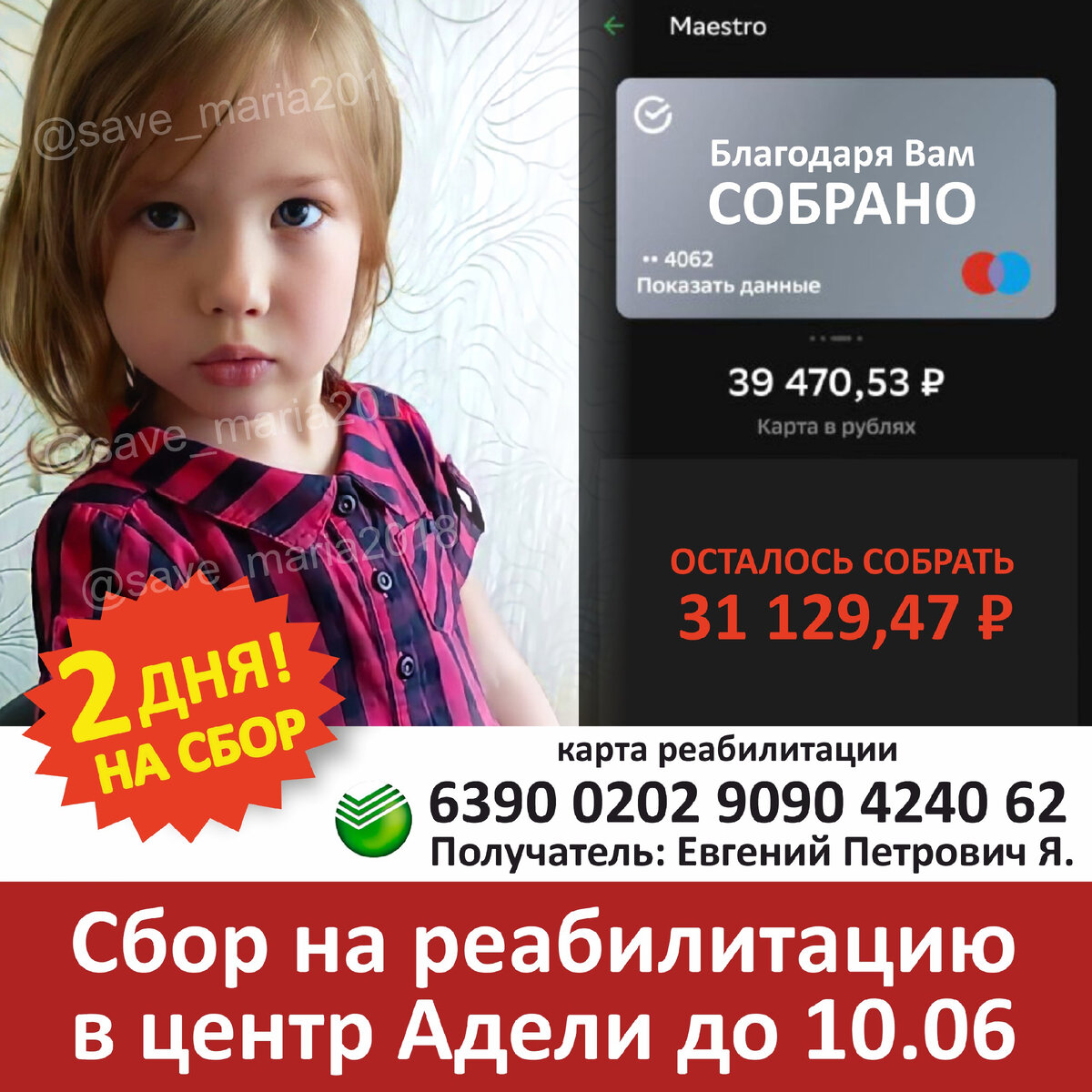 @save_maria2018 в Instagram. Несколько дней назад мы открыли сбор на реабилитацию в Адели на сумму 161 400 р. Ближайший свободный курс - в октябре, но предоплату в размере 70 600 р.необходимо внести до конца этой рабочей недели. Крайний срок - 10 июня, пятница. На данный момент собрано 39 470,53 р., до конца недели осталось собрать 31 129,47 р. Помогите успеть. Мы будем благодарны за любую посильную помощь. ⚡️Карта отдельная от основного сбора👇👇👇 💳 Сбербанк:6390 0202 9090 4240 62 Евгений Петрович Я (папа) ♨️ Поставь лайк ♨️ Добавить себе в сториз ♨️ Отправь репост своим друзьям и знакомым ♨️ Переведи посильную сумму #крайнийдень #дедлайн #10июня #посильнаяпомощь #телеграф #москвариум #достопримечательностимосквы #валдберис #wildberriesпромокоды #маруся0806