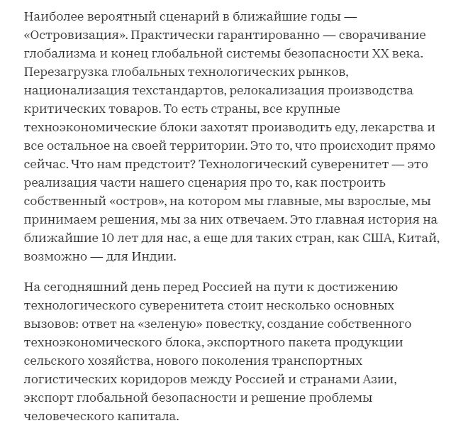 Прочитал я тут текст, товарища Пескова (это не тот, который пургу вечно гонит) и улыбнулся, вот вроде правильно всё говорит: Читаешь новости и понимаешь, что и про этого Пескова спустя пару-тройку лет скажут: "Пургу нёс". Смотрите сами, закрыли нам импорт из Европы, сели наши предприятия на опу и чего начали делать власти? Своё что ли развивать? Заводы отстраивать, производство налаживать? Нет, они пересели на импорт китайский, хотя сами китайские компании упорно открещиваются от работы с нами... Всё #импортозамещение с 2014 года, за редким исключением, свелось к тому, что мы один импорт другим заменили и призвали всех затянуть пояса... Дмитрий Песков, всё верно излагает, у нас другого выбора нет, кроме движения к автономной экономике, наращиванию населения, торговли с Азией, развитию сельского хозяйства, но реализуются планы, с точностью до наоборот, сами знаете, как у нас со всем этим дела обстоят... Одни только учёные красавцы, стараются, работают, изобретают... Правда, #государство