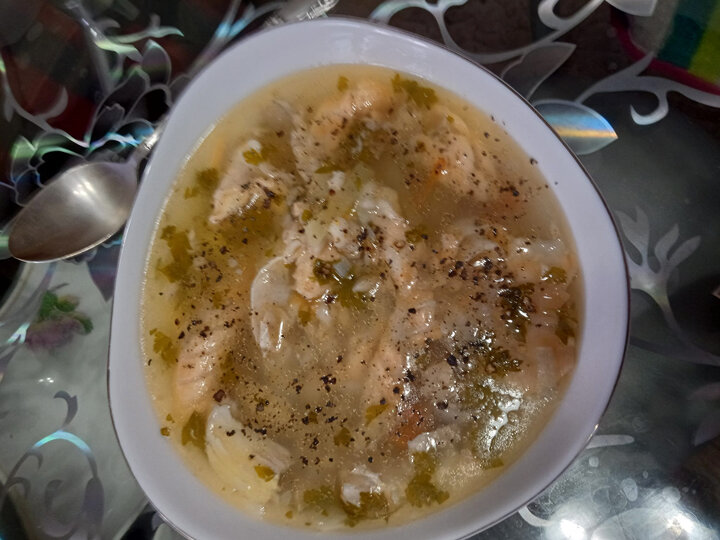 Сегодня - суп из сёмги. Не пишу «уха», так как считаю, что уха - это на костерке, с большим пучком укропа, с пшеном, с дымком, в кругу друзей… А дома... это просто рыбный суп. Вкусный, ароматный, наваристый, но суп. Купила набор из сёмги для супа - очень хороший, с головой, хвостом, брюшком и отличными кусочками рыбки. Все очищено и выпотрошено! Как увидела, сразу же захотела рыбного супчика. Бульон сварился очень быстро, минут 10 покипело и готово. Все «рыбные части» вынула в миску, разобрала от костей и хрящей. В бульон положила морковку, лук, половинку кабачка (вместо картошки, муж и не понял) и отваренную уже перловку, много укропа, петрушки. И один очищенный помидор свежий, мелко нарезанный. Соль, перец и чуть хмели сунели для аромата. Положила в готовый суп кусочки рыбки без костей, две минутки покипело, и всё - супчик готов! Получился наваристый и вкусный. Вот и пообедали - и супчик, и рыбка с овощами! Суп из сёмги и овощей Больше общения и рецептов - в группе "Рецепты для диабе
