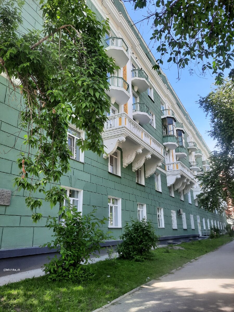 Во время прогулки по тихому центру Новосибирска нам на глаза попалась "сталинка", значительно выделяющаяся на фоне окружающих домов. Этот недавно отреставрированный памятник архитектуры является образцом жилого многоквартирного дома довоенного периода. Построенное во второй половине 30-х годов для работников Томской железной дороги здание выдержано в цветах, традиционных для железнодорожного ведомства в Новосибирске. Темно-зелёный фон и белые элементы декора. Это один из самых красивых домов на улице, подобных ему домов, с балконами, украшенными лепными кронштейнами, балюстрадами и цветными орнаментами на фасаде почти не встретить в городе. На углу дома - памятная доска Урицкому, в честь которого и названа улица.