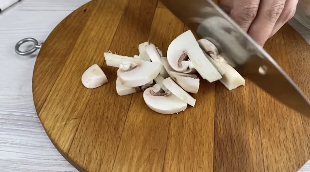 Я очень люблю экспериментировать с едой и готовить что-то по-новому. В конце недели в холодильнике собрались остатки разных продуктов, которые не использовала. Решила из них сделать салат и не зря! Получилось очень вкусно, сочно, а главное — ни один продукт не выбросила. Теперь готовлю салат по своему рецепту, когда хочется чего-то необычного. Делюсь рецептом: Готовила на днях горячее блюдо и у меня осталось немного шампиньонов, вот их будем использовать в первую очередь! Свежие шампиньоны нарезаем дольками среднего размера. Разогреваем на сковороде немного растительного масла. Обжариваем грибы до тех пор, пока из них не испарится вся вода,а тем временем мелко рубим чеснок. Далее добавляем щепотку соли, черный молотый перец и рубленый чеснок. Все перемешиваем и обжариваем буквально полминуты, чтобы чеснок отдал аромат (но не горел!!!). Снимаем с огня и перекладываем в салатник, чтобы грибы остыли. Следующий ингредиент — копченая курица. Обратите внимание,что всех продуктов - небольшое