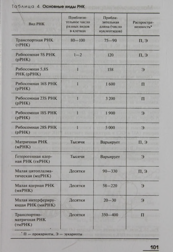 Помимо транспортной тРНК, существует еще и транспортно-матричная тмРНК (таблица 4, стр. 101), которая исчисляется десятками в клетке и которая раза в 3-4 длиннее от просто тРНК. Какая разница в выполняемых ими функций в данной главе не рассказывается.