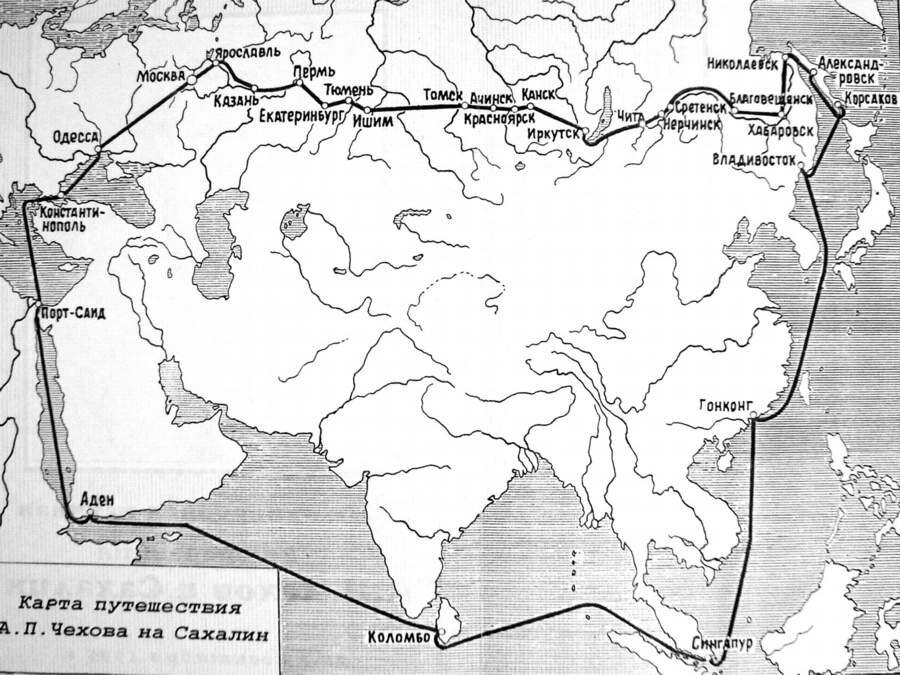Вернёмся, однако, к путешествию. Проследуем за Чеховым по "единственной жиле", похожей на "чёрную оспу". До Иркутска он добрался лошадьми. Далее плыл на пароходе через Байкал, а затем снова ехал на лошадях до Сретенска. От Сретенска пароходом по Амуру до Николаевска, а там пароходом же через Татарский пролив на остров Сахалин.