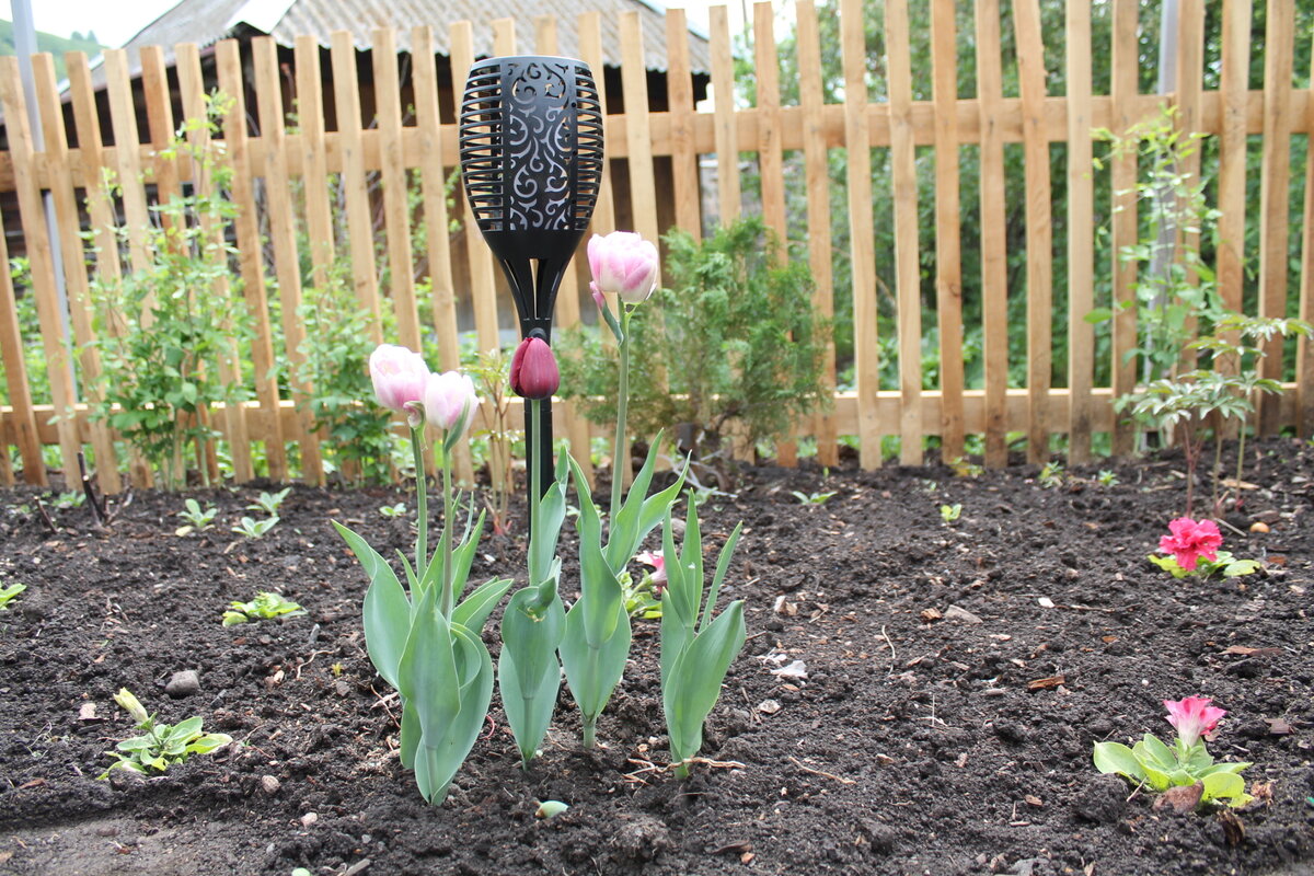 Мне понравились высокие светильники в виде факелов, их можно установить в цветнике или прикрепить к стене. Пока цвели тюльпаны, факелы освещали их, придавая оттенкам бутонов большей глубины. Фотография не может передать эффекта горящего огня. Кажется, что внутри факелов живое пламя, его всполохи выглядят реалистично.