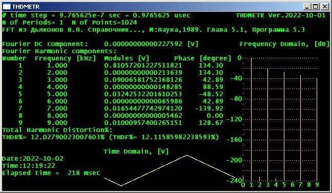 "Даром дадено, даром давайте", - И. Христос. Версия 2026.04.23, исправленная и дополненная. Версии измерителя нелинейных искажений THDMETR в Circuit Simulator'е на Turbo Basic'е требуется не такой гигантский, как GOOGLE, но тоже большой (4.43 МБ) DOSBox-0.74, поэтому автором была написана версия THDMETR'а на Си в MinGW Developer Studio 2.05, работающая без DOSBox'а. Известен THDF симметричного треугольного сигнала в аналитическом виде, который равен: THDF = SQR(Pi^4/96-1) ≈ 0.1211529265193041 (THDF% ≈ 12.11529265193041%) По этому значению можно приблизительно оценить ошибку измерения (точность) измерителя нелинейных искажений при больших величинах THDF%. Рис.1. Снимок результата вычисления THDMETR'ом THDF% симметричного треугольного сигнала. На снимке видно, что при больших величинах измеренный THDF% имеет пять верных знаков десятичной мантиссы, а в спектре присутствуют почти только одни нечётные гармоники, что свидетельствует о хорошей