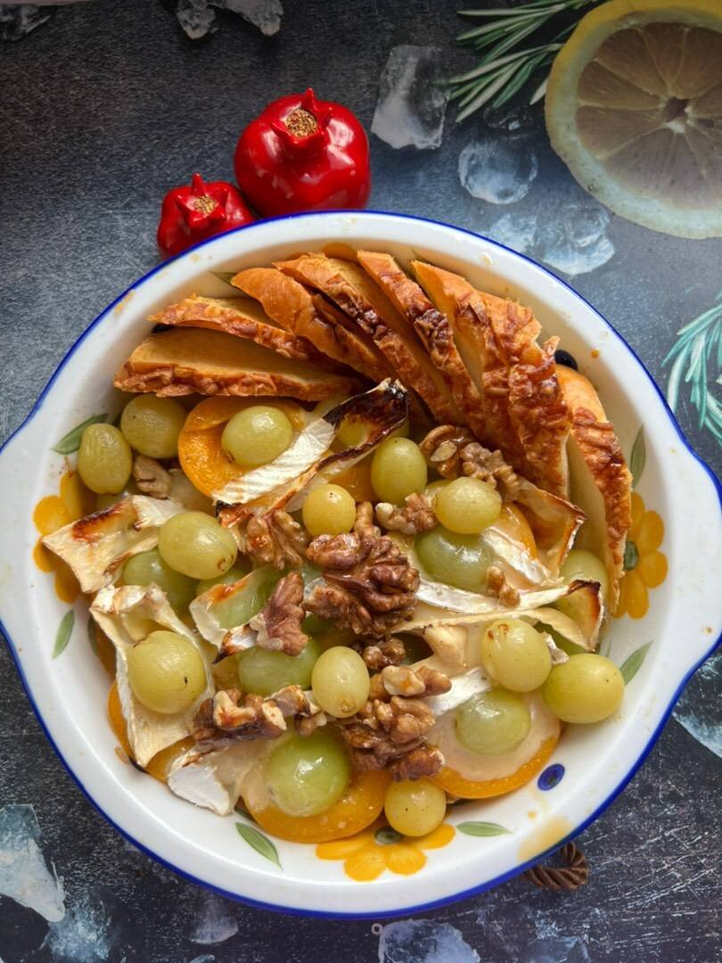 Ингредиенты: Сыр бои, Абрикосы, Виноград, Мёд, Грецкие орехи, Багет, Оливковое масло