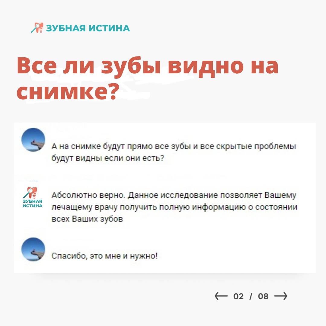 3D снимок зубов - трёхмерное изображение челюсти в мельчайших подробностях. В современной стоматологии такое исследование является прогрессивными и востребованными. Обычно их проводят до и после лечения. Результаты компьютерной томографии используют в разных областях стоматологии. В зависимости от назначения лечения на снимках можно увидеть разные данные. Что могут показать результаты КТ исследования: ▶ КТ для лечения зубов: В терапевтической стоматологии для постановки точного диагноза и определения правильного лечения, КТ показывает такие данные, как: Также компьютерная томография челюсти покажет, насколько правильно проведено терапевтическое лечение. В качестве контрольного исследования, процедуру можно провести повторно, например, после пломбирования каналов. ▶ КТ для удаления зубов: Часто для хирургического вмешательства в стоматологии нужен детальный подход в предварительной диагностике. В этом случае на результатах исследования КТ врач увидит: ▶ КТ для протезирования: Перед восс