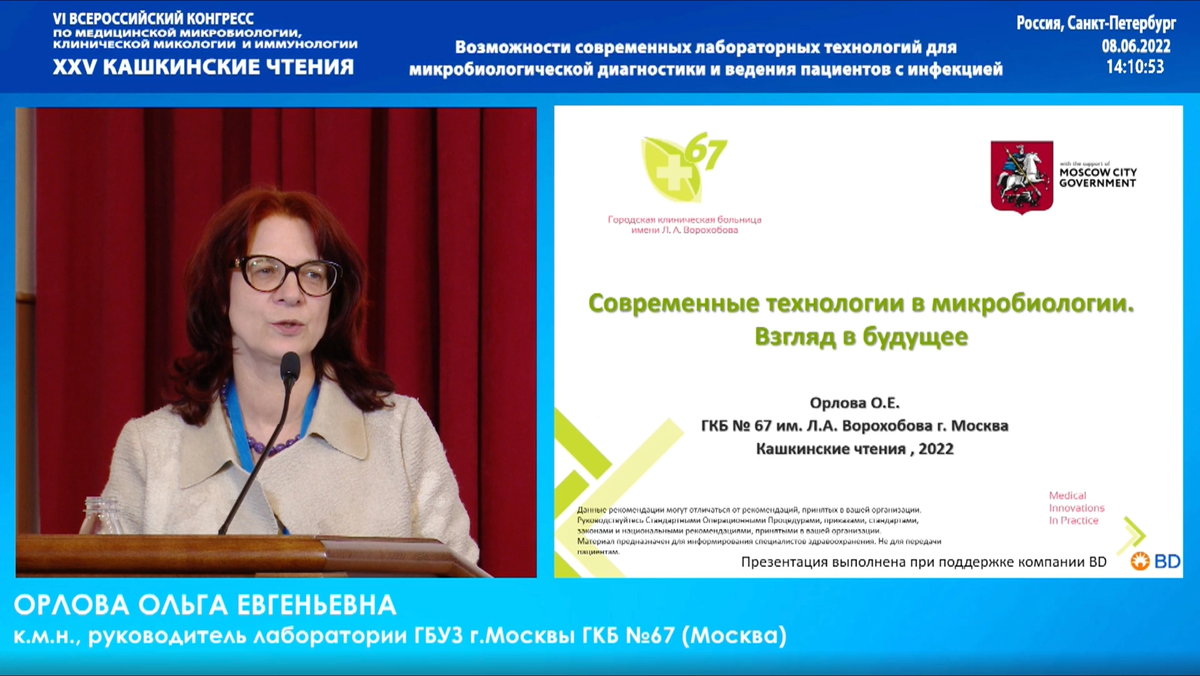 🔬 В эти минуты руководитель лаборатории микробиологии ГКБ №67 Ольга Орлова принимает участие в главном ежегодном событии в области российской медицинской микробиологии - "Кашкинских чтениях"! Традиционно их проводит НИИ медицинской микологии имени П.Н. Кашкина 🏫 на базе Государственного университета им. И. И. Мечникова (Санкт-Петербург). Ольга Евгеньевна представила на конгрессе интереснейший доклад "Современные технологии в микробиологии. Взгляд в будущее", в котором рассказала о перспективах развития отрасли 📈 и последних достижениях нашей лаборатории микробиологии ⭐️. 👏 Мы поздравляем Ольгу Евгеньевну с успешным выступлением и обещаем поделиться видео-версией 📽 её доклада, как только она будет опубликована на официальном сайте конгресса!