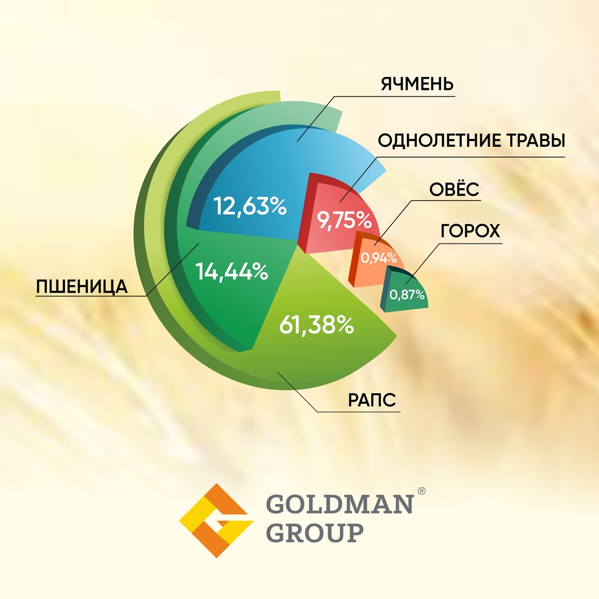 Холдинг завершил кампанию-2022. В этом году посеяли шесть видов культур: При этом, площади под рапс увеличили в четыре раза. Эта масличная культура наиболее востребована и внутри холдинга, и на внешнем рынке. Всего было обработано 60 тыс. га земель. Часть — под пары, часть — под посевы. В кампании-2022 Goldman Group задействовал в 2,5 раза больше техники, апгрейдили и систему цифрового земледелия. В арсенале появилось новое оборудование, контролирующее посевную колею при помощи GPS. Умное распределение семян позволило значительно сэкономить время, а соответственно повысить эффективность. Кибертехнологии помогут аграриям и во время обработки всходов — заранее настроенная система проследит, чтобы каждый росток получил нужное количество удобрений. Кстати, только под рапс в этом году их было приобретено 22 вагона — это 1 500 тонн. Для сравнения — одна МКС (Международная космическая станция) весит всего 420 тонн. 😱 В 2022г холдинг ожидает особенно высокой урожайности. Напомним, что в пре