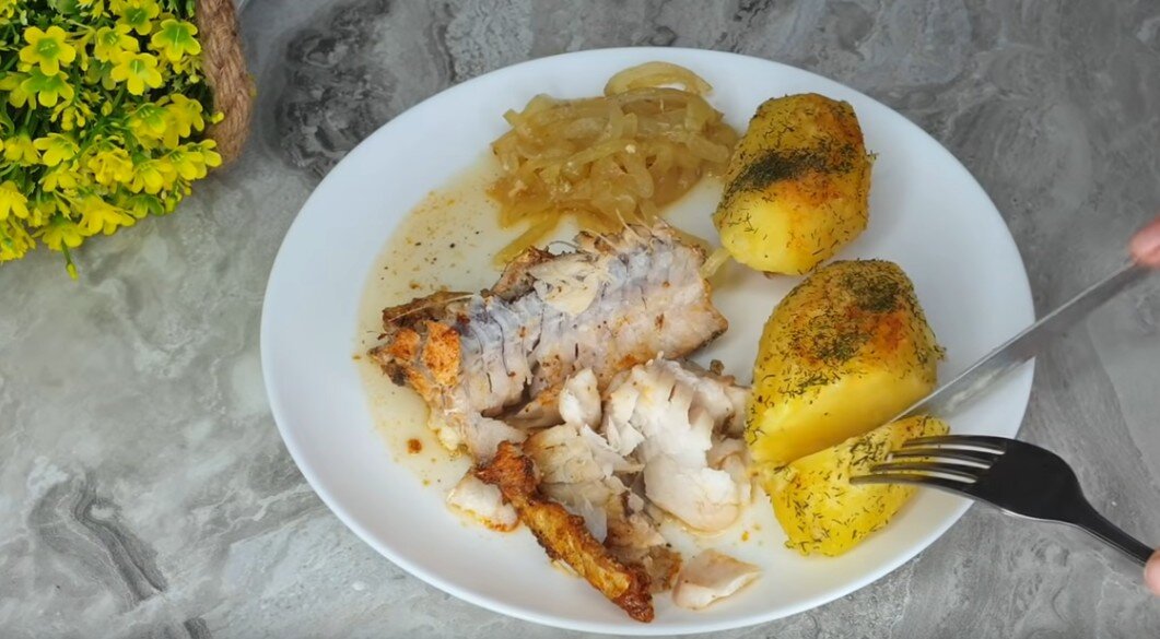 5. Тем временем, наша вкусная, промаринованная рыбка уже пропеклась. Картошка тоже готова. Можно наполнять блюда для ужина.