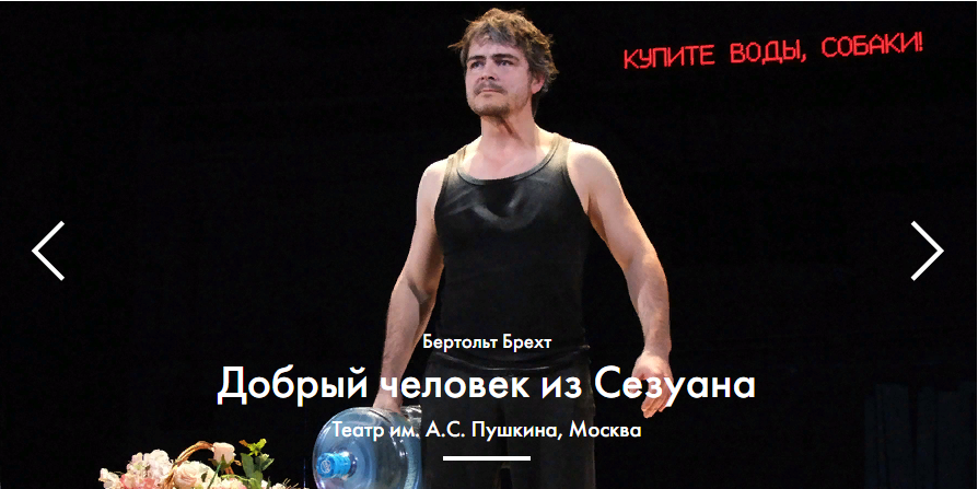 Фестиваль «Золотая маска» дарит зрителям встречи с мастерами искусств разных городов. 7 июня я посетил спектакль по пьесе Бертольда Брехта «Добрый человек из Сезуана» московского театра имени Пушкина. Спектакль проходил в здании ТЮЗа. Полный зрительный зал. Знакомые лица в фойе и в зале из актерской среды среди зрителей. Действие началось. И мы постепенно стали погружаться в этот удивительный мир. Открытый занавес дает возможность предварительно еще до начала спектакля увидеть внутренности сцены, декорации места действия, попробовать угадать, кто и где будет находиться. Любое шевеление на сцене тут же срабатывает как сигнал к началу. И зрительный зал затихает, все глаза устремляются на сцену. А на сцене появляется водонос. Сначала он говорит как актер, что-то делает, двигается, но в определенный момент, когда он надевает свой бархатный халат, его пластика и речь меняются. И перед нами уже не актер, а персонаж Брехта. На заднем плане мелькает героиня, бывшая проститутка, а ныне хозяйка