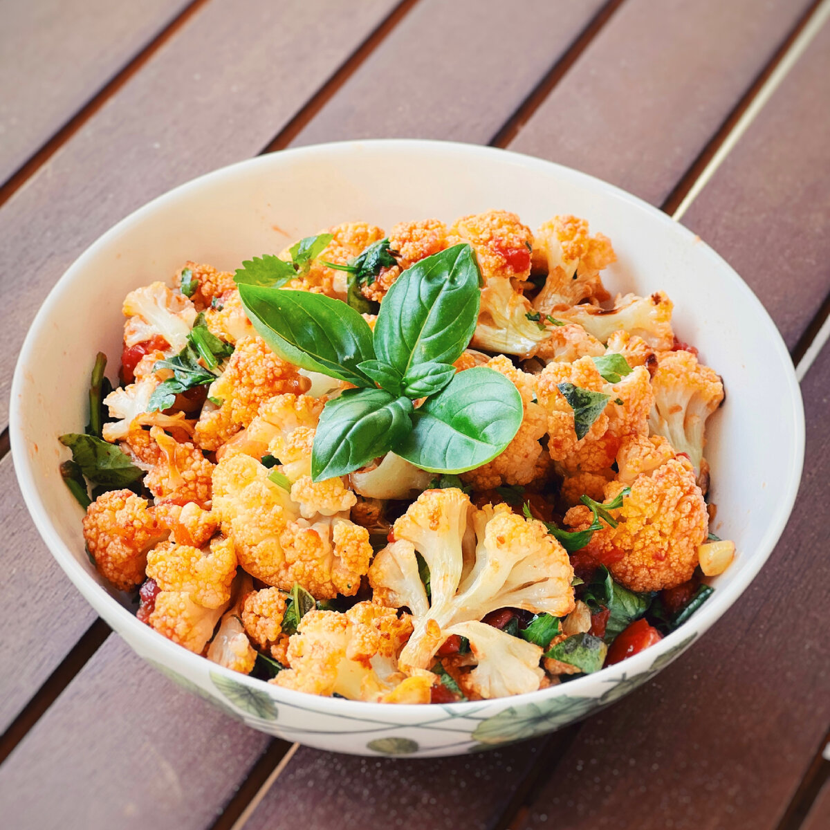 Привет, друзья! Как ваше настроение сегодня? Овощи сейчас такие вкусные. Хочется их готовить, как можно чаще. Сегодня приготовила тёплый салат из цветной капусты. Получилось очень вкусно! Рецепт очень доступный, из простых ингредиентов. Рекомендую попробовать! Ингредиенты: ✔️1 небольшой кочан цветной капусты ✔️Масло растительное (у меня масло авокадо) - 1 ст. л. ✔️Сладкая или копченая паприка - 1/2 ч.л. ✔️Соль по вкусу ✔️15 помидоров черри ✔️Горсть кинзы или петрушки ✔️½ лимона - по желанию Приготовление: 1. Разогрейте духовку до 200С. 2. Цветную капусту нарежьте небольшими соцветиями. Сбрызните маслом, посыпьте солью и паприкой и перемешайте. Выложите на противень. Запекайте в течение 15-20 минут или пока цветная капуста не станет золотисто-коричневой. 3. Тем временем помидоры потушите в сковороде под крышкой до мягкости. 4. Выложите в большую миску помидоры, зелень, добавьте обжаренную цветную капусту и перемешайте. Попробуйте и при необходимости посолите и добавьте сок лимо