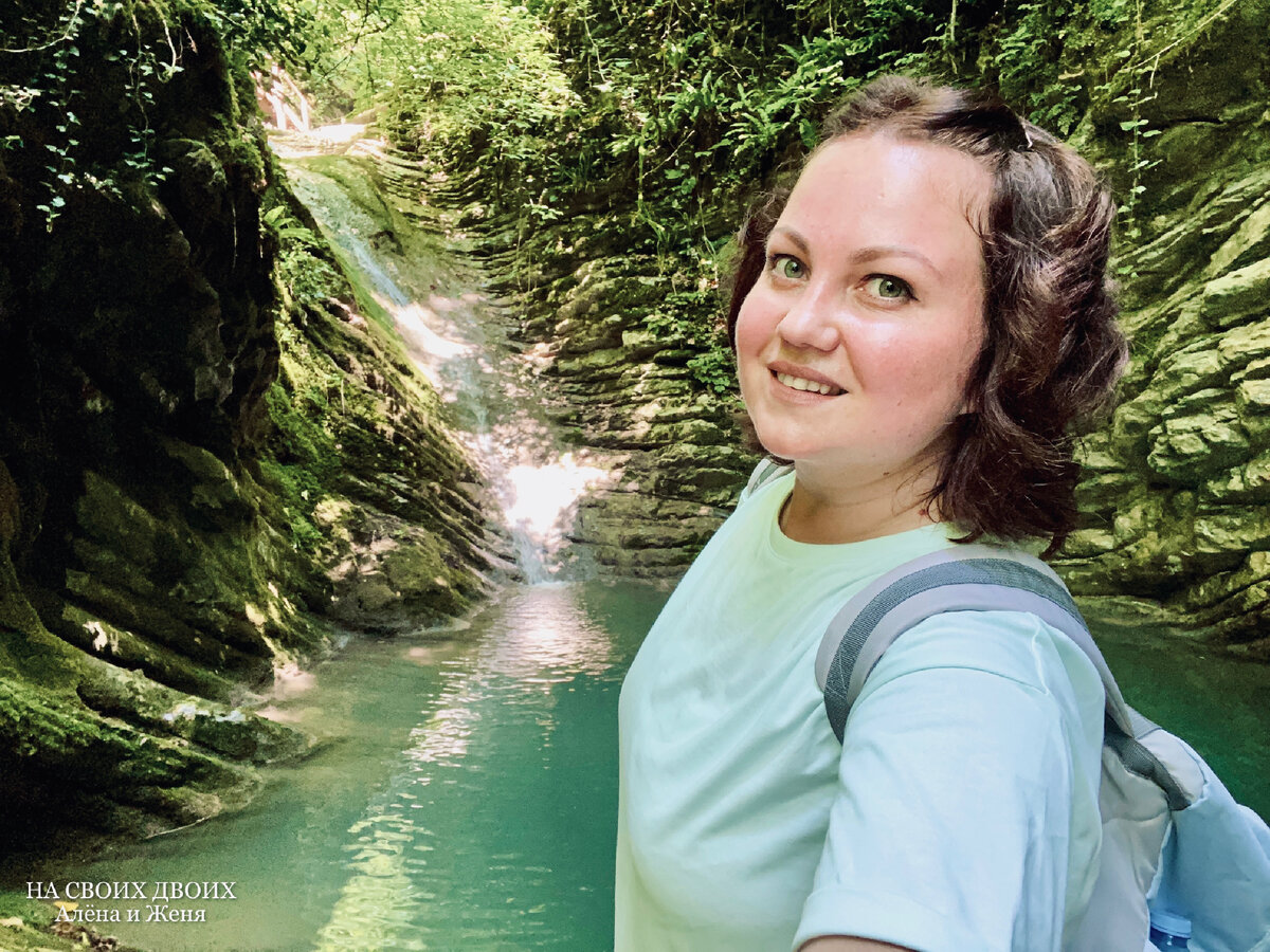 Дальше было самое красивое (на мой вкус) место в этом ущелье - Изумрудная купель. Нежнейшего бирюзового цвета вода в природной ванне, падающий небольшой водопад и живописные пейзажи вокруг, которые создала матушка-природа.