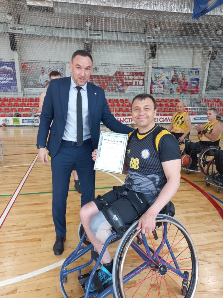 Баскетбольная «Волга» стала второй во Всероссийском турнире по баскетболу на колясках «Ульяновск OPEN 2022», состоявшемся 25-27 мая в ФОК «Орион». Сегодня Министр физической культуры и спорта Ульяновской области Рамиль Егоров посетил тренировку «Волги» и поздравил с успешным выступлением игроков , тренера команды и руководителя ОГКУ «Ульяновская спортивно-адаптивная школа» Виктора Баскакова .