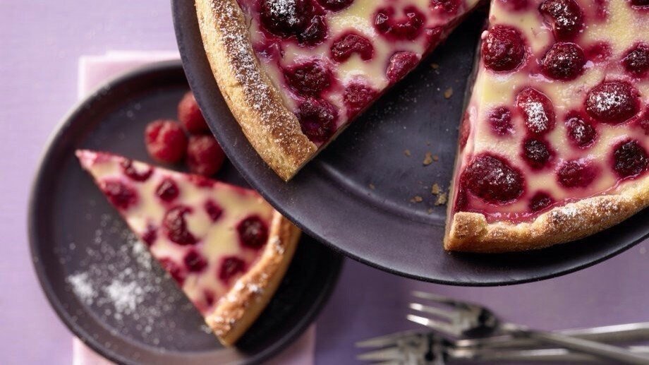 Посыпать мукой рабочую поверхность, выложить на нее тесто и раскатать круг диаметром около 28 см. Круглую разъемную форму для пирога ( или сковороду), диаметром 24 см, смазать растительным маслом, или жиром, присыпать мукой. Уложить тесто в форму, загнув края и сформировав рант высотой 2 см.