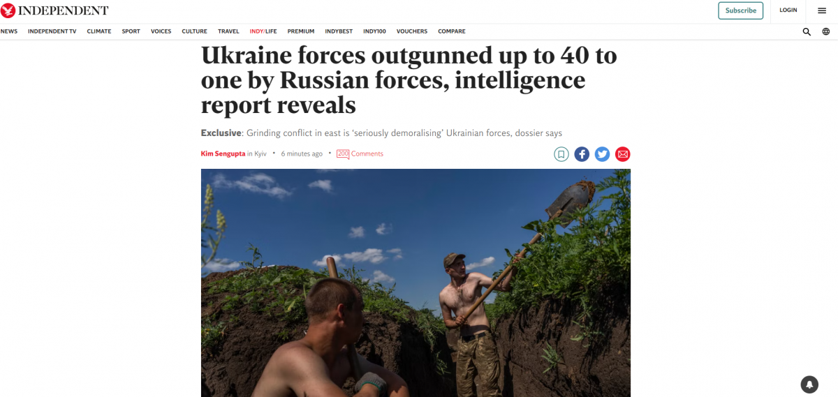 Превосходство российской армии по артиллерии 20-кратное, а по количеству выпускаемых снарядом – в 40 раз Положение Вооруженных сил Украины (ВСУ) является катастрофическим — украинские военные несут большие потери, бойцы все чаще бросают позиции или сдаются в плен. Такие выводы озвучены в отчете американской разведки по ситуации на Украине, данные из которого 9 июня приводит британское издание Independent. «Украинские войска несут огромные потери, так как уступают российским войскам 20 к одному в артиллерии и 40 к одному в боеприпасах», — пишет издание. В статье отмечается, что Украина практически исчерпала все имеющиеся у нее запасы, в то время как российская армия не намерена сдавать свои позиции. На данный момент у украинской армии почти закончились боеприпасы для реактивных систем залпового огня. Также американская разведка обратила внимание на преимущество российской армии в воздухе и отметила неэффективность украинских противотанковых средств, поскольку на первый план в боевых де