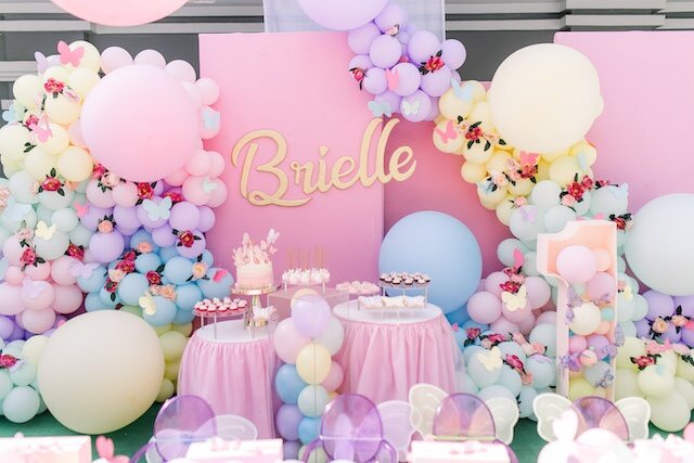 Что может быть волшебнее, чем вечеринка с бабочками! Такая тематика понравится любой девочке, вне зависимости от возраста. Отличительная черта этого праздника — огромное количество воздушных шаров! Из них декораторы собрали большущую гирлянду для фотозоны. Здесь же был и сладкий стол. Посуду и декор для такой вечеринки можно найти у нас на сайте! Хоть праздник и проходил на улице за домом, шарами украсили и потолок установленного купола веранды. Все гирлянды дополнительно украсили бумажными цветами и бабочками, получилось очень сказочно. Стол сервировали волшебной коллекцией Мери Мери с бабочками и цветами! А еще все детки получили в подарок эти розовые коробочки с игрушками и сладостями. Еще больше магии было на сладком столе! Начиная с волшебного тортика, украшенного будто бы парящими бабочками, заканчивая закусками “на один укус”: печенье, крошки-капкейки, панна-котта и кейк-попсы. Но что больше всего удивило и порадовало детей — каждый стульчик был украшен волшебными крылышками, к