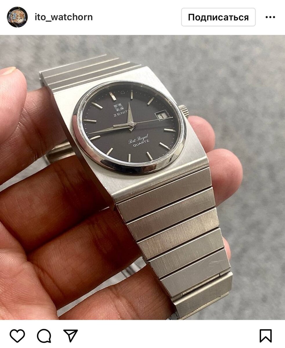 В 1980 годах в качестве ответа на кварцевую революцию многие швейцарские мануфактуры начали выпускать часы с электронным механизмом. В том числе и Zenith. И хотя у меня этот бренд вообще не ассоциируется с квадратными и прямоугольными корпусами, мне очень нравится этот Port Royal с кварцевой начинкой.