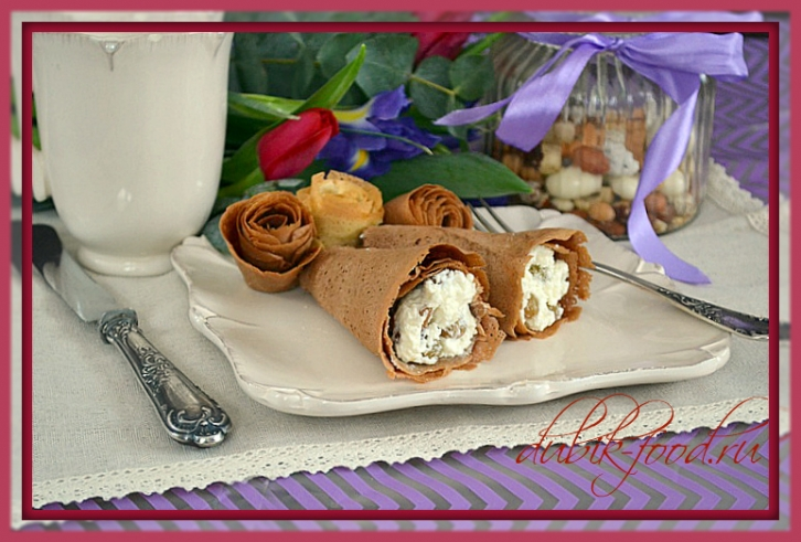 Шоколадные блинчики с начинкой из творога получаются аппетитными и вкусными. Приготовить блины можно по вашему любимому рецепту, добавив в тесто немного какао, а завернуть - в виде конвертиков, трубочек или конусов, так как вам больше нравится. Я предлагаю свой вариант. Ингредиенты