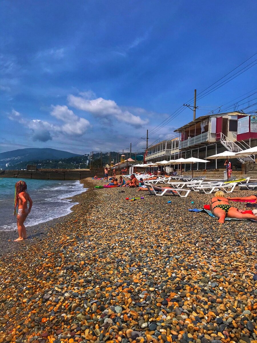 Наше небольшое путешествие началось где-то рядом с Хостой (район Сочи), но где конкретно я до сих пор не знаю. Живем в 100 метрах от моря и это единственный "жирный" плюс всей этой истории. Для любителей обзоров пляжей и жилья буду рассказывать о местности. Как я говорил, что идти до пляжа 5-6 минут, но надо переходить железную дорогу. Арендовали мы апартаменты - это квартира с одной спальней за 2400 в сутки. Хотя хозяин говорит, что сейчас уже начал сдавать за 3000 рублей. Для подписчиков я уже оставлял ссылку на нашу группу вконтакте и там можно получить 1000 рублей в на первое бронирование. Дальше мы проживаем здесь 7 дней и нам начисляется еще 5400 рублей, которые можно потратить на новое бронирование. Что мы и будем делать. Пляж большой и есть где искупаться. Справа есть кафе, где можно купить напитки и кофе. Сегодня продавали кукурузу за 120 рублей, но она совсем не желтого цвета и невкусная. Наверное еще рано для кукурузы. Рядом есть абсолютно все: магазины продуктов, шашлыки,