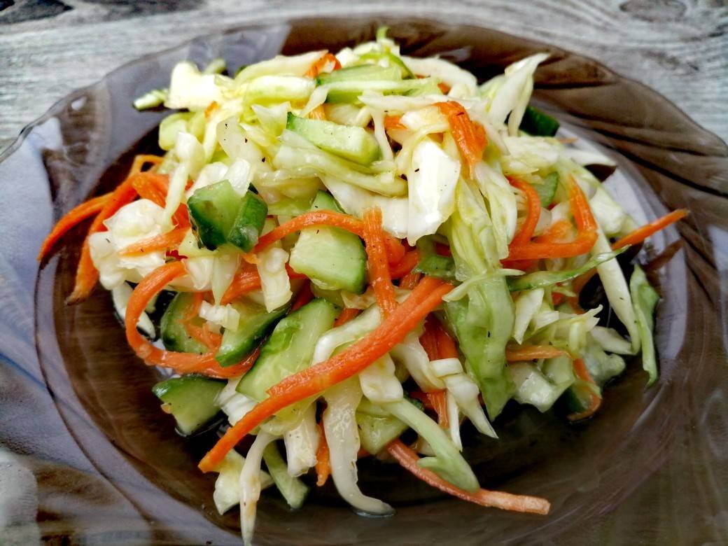 Ингредиенты: капусты, огурец, морковь, зелени по вкусу, соли, сахара, Перец, уксуса, растительного масла