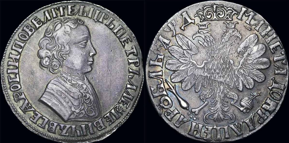 Отмечу, рубль изображенный на этом фото - это рублевая монета 1704 года выпуска, на ней изображен портрет молодого Петра Великого, на реверсе двуглавый орел, где хвост орла широкий, а корона закрытая, крест державы украшен.