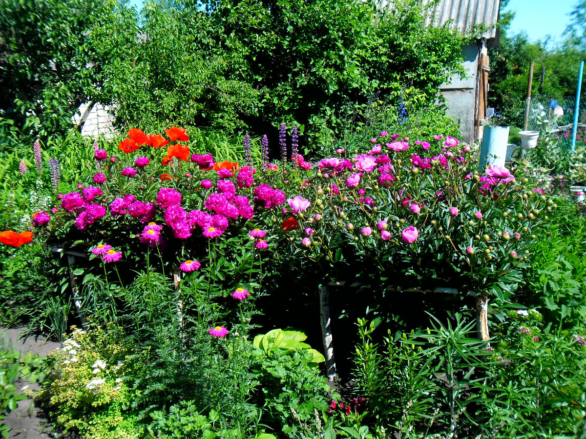 Обожаю когда цветут пионы, пусть и короткий период их цветения, но сколько наслаждения и радости они приносят в сад. Кусты в этом году огромные, цветов много, аромат стоит на весь двор, но даже и после цветения они не портят вид сада. Разнообразия у меня конечно нет, всего два сорта розовый и бордовый, но это можно исправить. А также сегодня расцвела моя малышка, роза бордюрная. А тут пионы, маки, роза морщинистая, вид с другой стороны. Цветет лапчатка травянистая, у меня она как сорняк растет. Горка радует и территория возле нее, цветут солнцецветы, тимьян, мыльнянка, гвоздики- травянки, лен. Начинает цвести турецкая гвоздика. За что я люблю этот ирис, растет себе скромненькими синими цветочками, никуда не падает, не разваливается и до самой осени украшает цветник. Продолжает цвести вербаскум. Ленок голубой, его тоненькие стебельки колышутся на ветру, как будто бабочки порхают. Спасибо за внимание. Благодарю вас за ваши лайки и комментарии. А что сейчас цветет у вас в садах ?