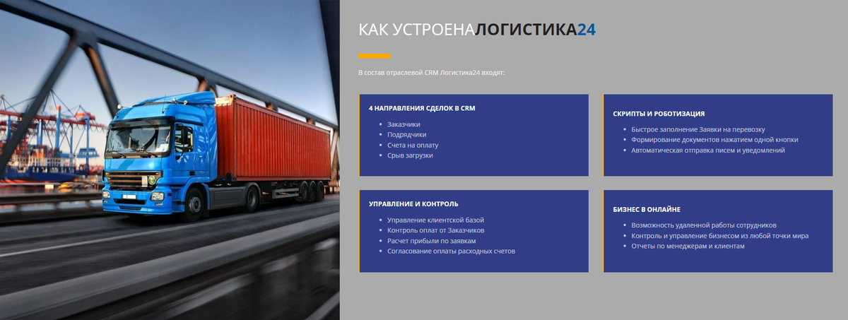 В современной транспортной логистике невозможно обойтись без автоматизации. Нужно связать между собой заявки от заказчиков, исполнение заказов подрядчиками, контролировать оплаты и сроки, документооборот и многое другое. Многие компании используют для этого большое количество различных программ и сервисов, а это влечёт за собой лишние расходы и увеличивает вероятность ошибок в работе. CRM система "Логистика24" позволяет автоматизировать все процессы и работать в режиме "одного окна"! Отраслевая CRM на платформе Битрикс24 разработана на основе опыта внедрения в десятки транспортных компаний: ПРИЛОЖЕНИЕ "ЛОГИСТИКА24: CRM ДЛЯ ГРУЗОПЕРЕВОЗОК" ПОЗВОЛЯЕТ: Обзор работы в Логистика24: Приложение "Логистика24: CRM для грузоперевозок" работает на всех коммерческих тарифах облачного Битрикс24 (Базовый, Стандартный и Профессиональный) и доступно по подписке Битрикс24.Маркет. ПОПРОБОВАТЬ CRM ЛОГИСТИКА24 БЕСПЛАТНО >>>