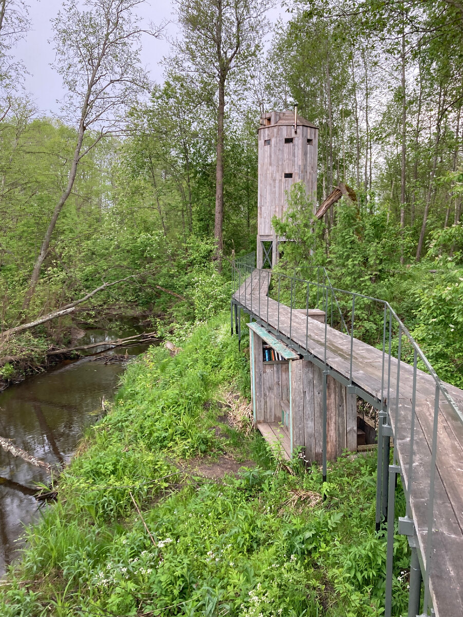 Итак, еще во время нашей прогулки по Арт-Усадьбе пошел дождь, но мы решили исследовать и третью часть комплекса - Парк, который начинается практически от пляжа, и не прогадали! Концепция Парка - лесная библиотека. И вот первый из ее залов) Единственный большой и хотя бы отдаленно напоминающий классическую крытую библиотеку. Местность представляет собой широколиственный лес со включением заболоченных участков, по которому проложена сеть деревянных настилов. Частично маршрут проходит практически по ручью. Периодически встречаются различные домики. Вот это, например, автобусная остановка и некий дом с окнами из желтого стекла с видом на воду зеркальную стену из листового металла, отгораживающую парк от соседних участков в этом месте. И во всех этих сооружениях на полочках также лежат книги. Экотропы над водой иногда на уровне земли, а иногда и в воздухе под метр над поверхностью создают полное погружение в природу. Ты не просто гуляешь по лесу - ты внутри леса, ты его часть. Наступает по