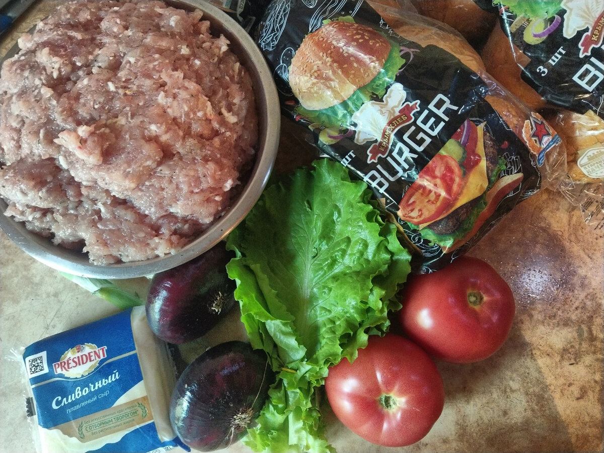 Ингредиенты: Приготовление: Начнем с фарша. У меня свинина+курятина. Лука нет. Только соль и перец. Сильно переминать и отбивать мясо не нужно - будет жёстким. Добавляем специи, немного помешали и оставили на минут 30, чтобы солт и перец хорошо разошлись. Часть фарша, равную одной котлете, выкладываем на рабочую поверхность. И формируем котлету просто равномерно распределяя ее по поверхности. Она должна быть больше по диаметру, чем булка. Так как при готовке она ужаривается. Потдеваем аккуратно лопаткой котлету и переложить на разогретую сковороду. Обжарить с двух сторон несколько минут. Лук порезать тонкими кольцами и сбрызнуть уксусом, огурцы и помидоры режем также тонкими кружками, листья салата вымыть. Чайную ложку горчицы, смешиваем с 2 ст.л. майонеза или сметаны, 1/2 ч.л. итальянских трав. Все хорошо перемешать. Булку разрезать пополам и положить в электрогриль и немного прогреть, чтобы получилась лёгкая хрустящая корочка. На обе половины булочки наносим тонким слоем кетчуп или