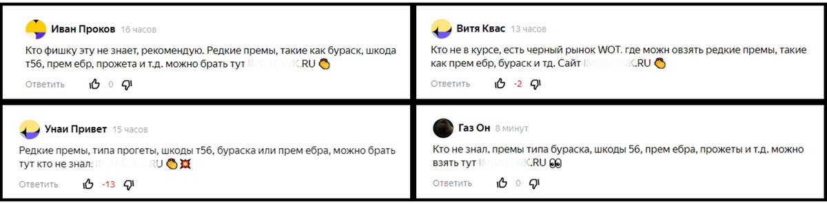А они появляются с завидной регулярностью вновь и вновь. И ведь "работают", если можно так выразиться, с "нужной" тематикой читателей. На танковом канале рекламируют танковый сайт с якобы халявными танками, то чёрным рынком его назовут, то просто низкими ценами поманят.