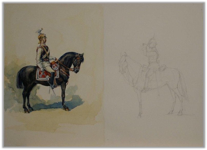 Итак, делаем набросок. Чтобы сэкономить, я по два гвардейца пихаю на один большой лист. Бумага Фабриано, 36х50см, пополам с хлопком. Набросок делаем тонким цанговым карандашом НВ. С линиями аккуратно надо, акварельная бумага не любит ластики и все такое, поэтому я, перед тем как армию отрисовывать, потренировалась в наброске именно по теме "всадник". А, забыла - срисовываю с рисунков Карла Беккера.