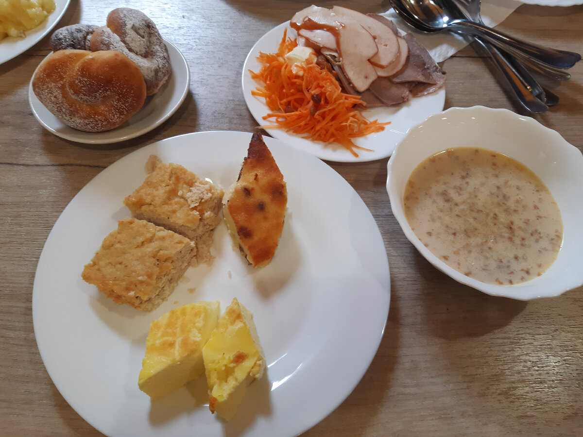 Всем добрый день, дорогие читатели! Мы сейчас на отдыхе в Крыму, в Алуште, брали отель с FB - трехразовым питанием шведский стол. Кормят хорошо, добротно, сытно. Докупали пока только мороженое (каждый день) и ягоды - клубнику и черешню. Да, ну и вино покупали. сегодня в отеле мы только завтракали у меня: гречневая каша, омлет, кусочек творожной запеканки и морковный салат с яблоками и сухофруктами. Все остальное набрали себе в контейнеры. Сегодня у нас выезд на целый день, далеко, сухпай решили не брать, а набрали на завтраке вареные яйца, нарезки языка и ветчины, творожную запеканку, хлеб, огурцы и помидоры. Надеялись успеть на ужин, но симферопольские пробки нас подвели и на ужин мы уже не успели, зато доели все, что оставалось. Сразу после завтрака выехали в сторону Ялты. Планировали на сегодня Ай-Петри, но погода подвела. Потому применили план Б: отправились в Бахчисарай. Попали в ливень, молния в горах - тоже так себе мероприятие, но ощущения острые👍😂 Вершины гор все скрыты в
