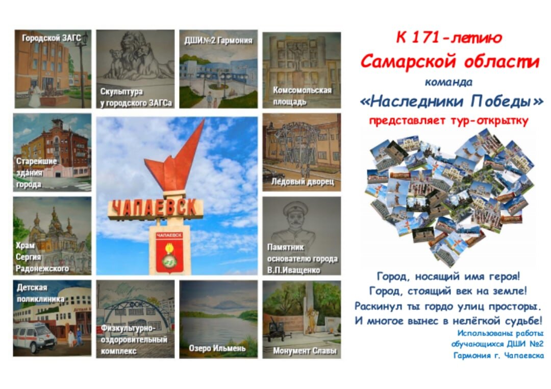 В рамках проекта "Моя губерния" команда «Наследники Победы» г. Чапаевск, ГБПОУ СОЧГК им. О. Колычева представляет вашему вниманию тур-открытку к 171-летию Самарской губернии. Для оформления открытки использованы работы обучающихся ГБПОУ СОЧГК им. О. Колычева и ДШИ №2 «Гармония» г. Чапаевск. У каждого из нас есть своя малая родина. Это место, где человек родился, вырос. Для нас малая родина – наш город Чапаевск. Чапаевск - маленькая частица России. В его истории местные события тесно переплелись с историей страны, являясь ее малой, но очень важной составляющей частью. Чапаевск город необычный - он был построен вокруг военного завода. Именно здесь впервые в стране начали производить новый для того времени вид взрывчатки – тротил. История Чапаевска началась в 1909 году со строительства Самарского Сергиевского порохового завода (в настоящее время ОАО "Полимер" и ФГУП "Металлист") в Самарском уезде между селами Титовка и Губашево вдоль железной дороги. 15 сентября 1911 года была открыт