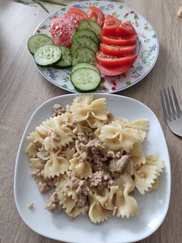 Очень нравится нам это блюдо, можно готовить с различными соусами из пакетиков, так быстрее приготовить на обед или ужин.#готовимвместе #рекомендую Ингредиенты: фарфалле, свиной фарш (можно любой), лук репчатый, растит.масло, Вода для отваривания макарон, Соль, черный перец , от Maggi для макарон, В фарш добавила приправы, что на фото Способ приготовления: В сковороду наливаем масло и обжариваем лук до золотистого цвета. Добавить к луку фарш и хорошо перемешать, чтобы не было комочков. Отдельно в посуду наливаем 1 стак. кипяченой воды и размешиваем пакетик от Maggi. Пока готовится фарш поставить воду и отварить макароны. В воду добавить соль и готовить до готовности около 10 мин. Готовить примерно 15 мин. Все перемешиваем в кастрюле с пастой. В конце добавить соль и перец по вкусу. К пасте подала салатик из свежих овощей. Приятного аппетита! Кому понравится мой рецепт оставьте свои отзывы. Буду вам благодарна!❤️🙋