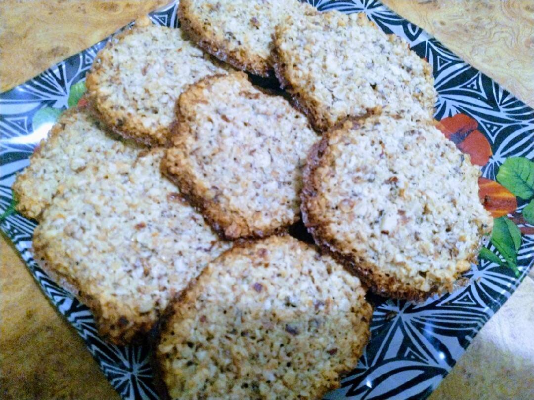 Ингредиенты: овсяных хлопьев, яйцо, сахара, сливочного масла или маргарина, ванильного сахара, любых молотых орехов Способ приготовления: Высыпать хлопья на сухую сковороду, подсушить их на слабом огне в течение 10 минут и затем измельчить. Желтки отделить от белков и растереть с сахаром и ванилином. Белки на это время поместить в холодильник. Размять масло и добавить туда желтки с сахаром, овсяные хлопья и орехи. Взбить белки в пену и ввести в овсяно-желтковую смесь. Всё хорошенько перемешать и выложить ложкой печенье на противень. Выпекайте печенье при температуре 180° около 15-20 минут.