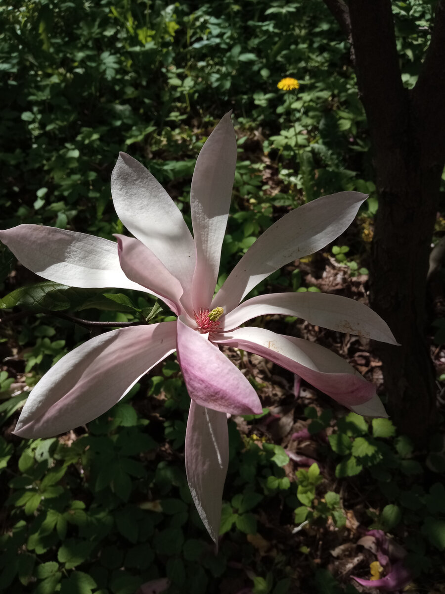 В 1 части статьи было рассказано об экспозиции Теневой сад. Во второй части познакомимся поближе с Вересковой горкой, коллекциями магнолий и яблонь. Вересковая горка находится слева от входа. Но чтобы на неё пропасть, нужно пройти мимо магнолий. Цветущие магнолии - это просто восторг! Не надо ехать на юг или в тёплые страны, а можно прямо в центре Москвы насладиться удивительным зрелищем. Магнолий в саду немного, это уже взрослые деревья. К сожалению, табличек с названиями в зоне видимости нет, поэтому посетителям предлагается просто полюбоваться цветением и получить от этого огромное удовольствие. В начале июня цветут виды, у которых цветки распускаются одновременно с листьями. Цветки крупные, кубковидные, нескольких расцветок: желто-кремовой, розовой и бело-розовой. Желто-кремовая только распускается, розовая на пике цветения, а бело-розовая уже отцветает. При отцветании лепестки опускаются вниз и повисают, словно тряпочки. Смотрится очень необычно. За магнолиями начинается